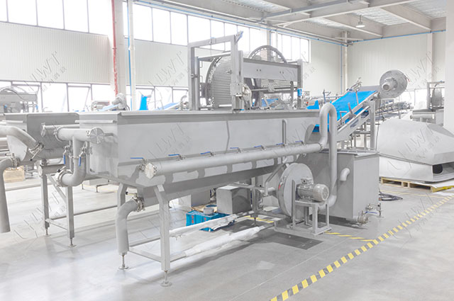 蔬菜通過(guò)提升設(shè)備送入清洗區(qū),初步去除泥土和雜質(zhì)。
